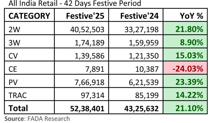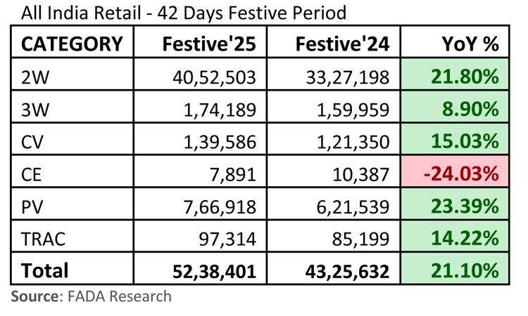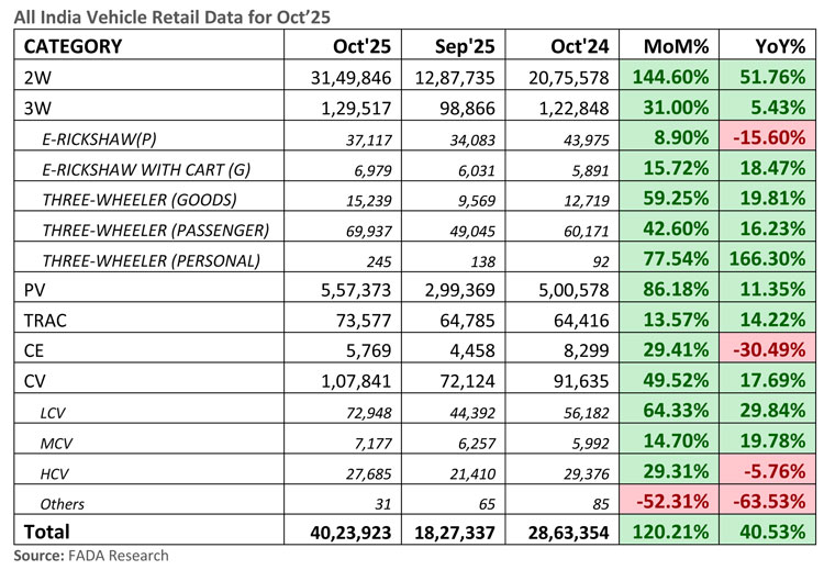 Reflecting on October 2025’s performance, FADA President Mr. C. S. Vigneshwar described it as a “landmark month where reforms, festivities, and rural resurgence came together to deliver record-breaking results.” Overall retail sales surged 40.5% YoY, marking the highest-ever growth in India’s auto retail history. The month stood out as a turning point where GST 2.0, festive fervour, and strong rural sentiment combined to create unprecedented momentum across all vehicle categories.