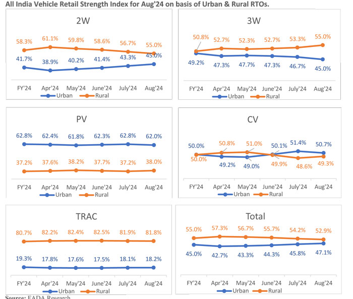 All India Vehicle Retail Strength Index for Aug’24 on basis of Urban & Rural RTOs.